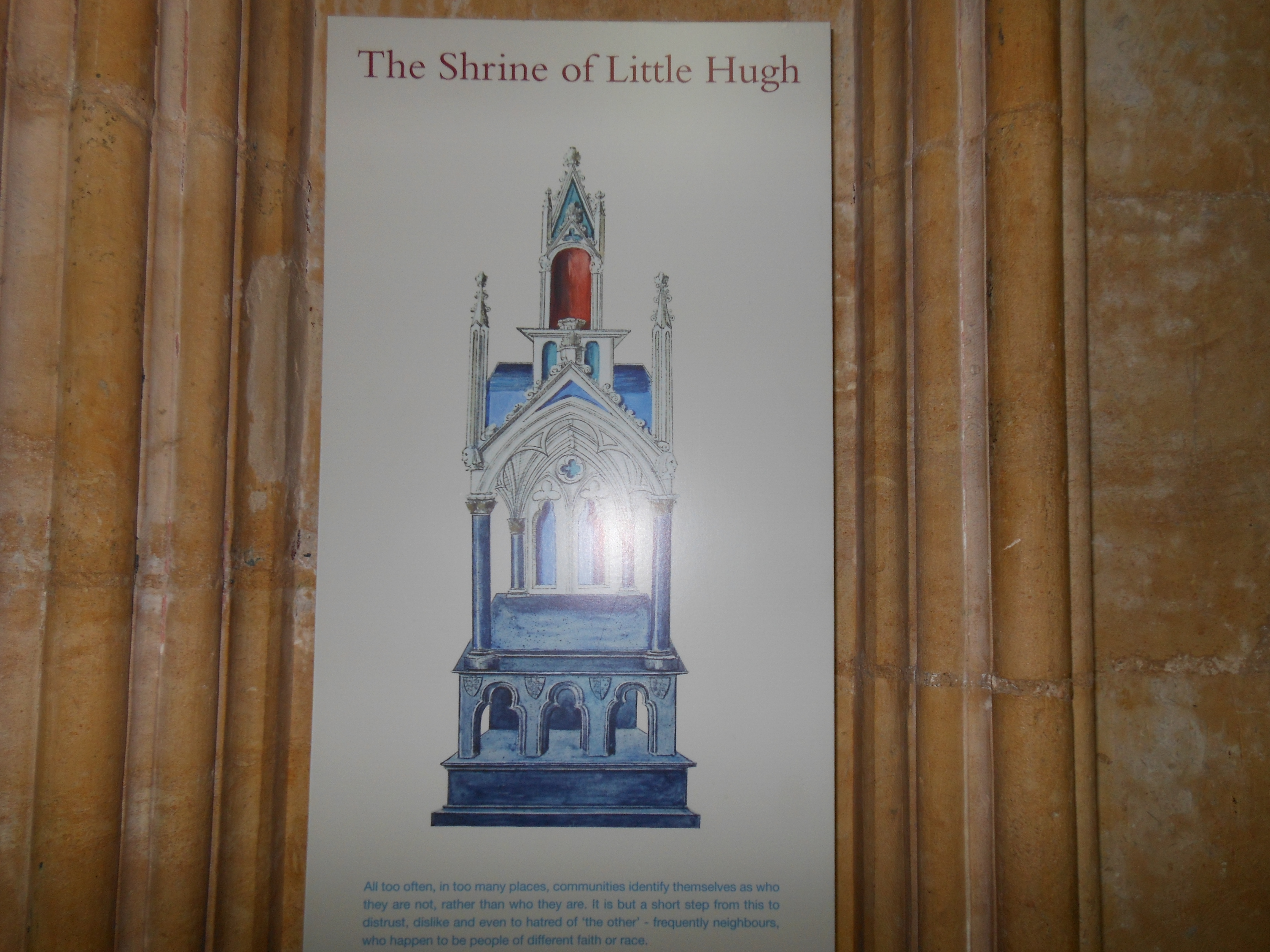 The tragedy of Little Hugh’s death was only worsened by the judicial murders of so many innocent Jews in revenge. Little St Hugh is the best known of the ‘blood libel’ saints and although a shrine was erected in Lincoln Cathedral, with a feast day of 27th August, Little Hugh was never canonised by the Vatican and has never been included in the official roll of Catholic martyrs. The shrine inside the cathedral, although still there, has lost its canopy and now has a sign at the side, explaining the legend and telling the sad tale of the boy’s death and its dreadful aftermath.