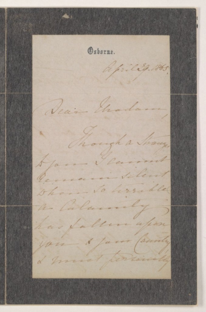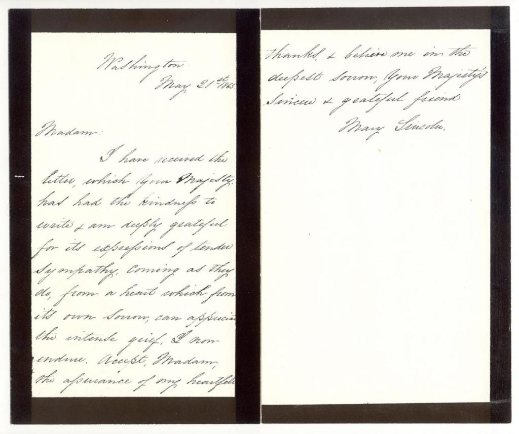 I have received the letter, which Your Majesty has had the kindness to write, & am deeply grateful for its expressions of tender sympathy, coming as they do, from a heart which from its own sorrow, can appreciate the intense grief I now endure. Accept, Madam, the assurances of my heartfelt thanks &believe me in the deepest sorrow, Your Majesty’s sincere and grateful friend.