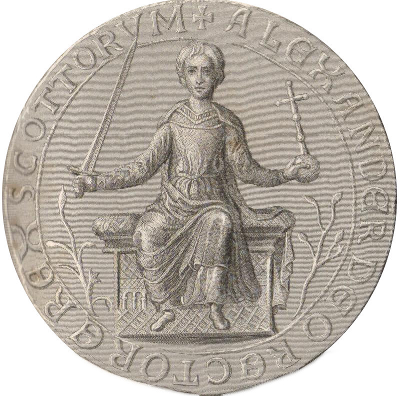 Steel engraving and enhancement of the Great Seal of Alexander II, King of Alba (Scotland) (Unknown author, Public domain, via Wikimedia Commons) https://commons.wikimedia.org/wiki/File:Alexander_II_(Alba)_i.JPG