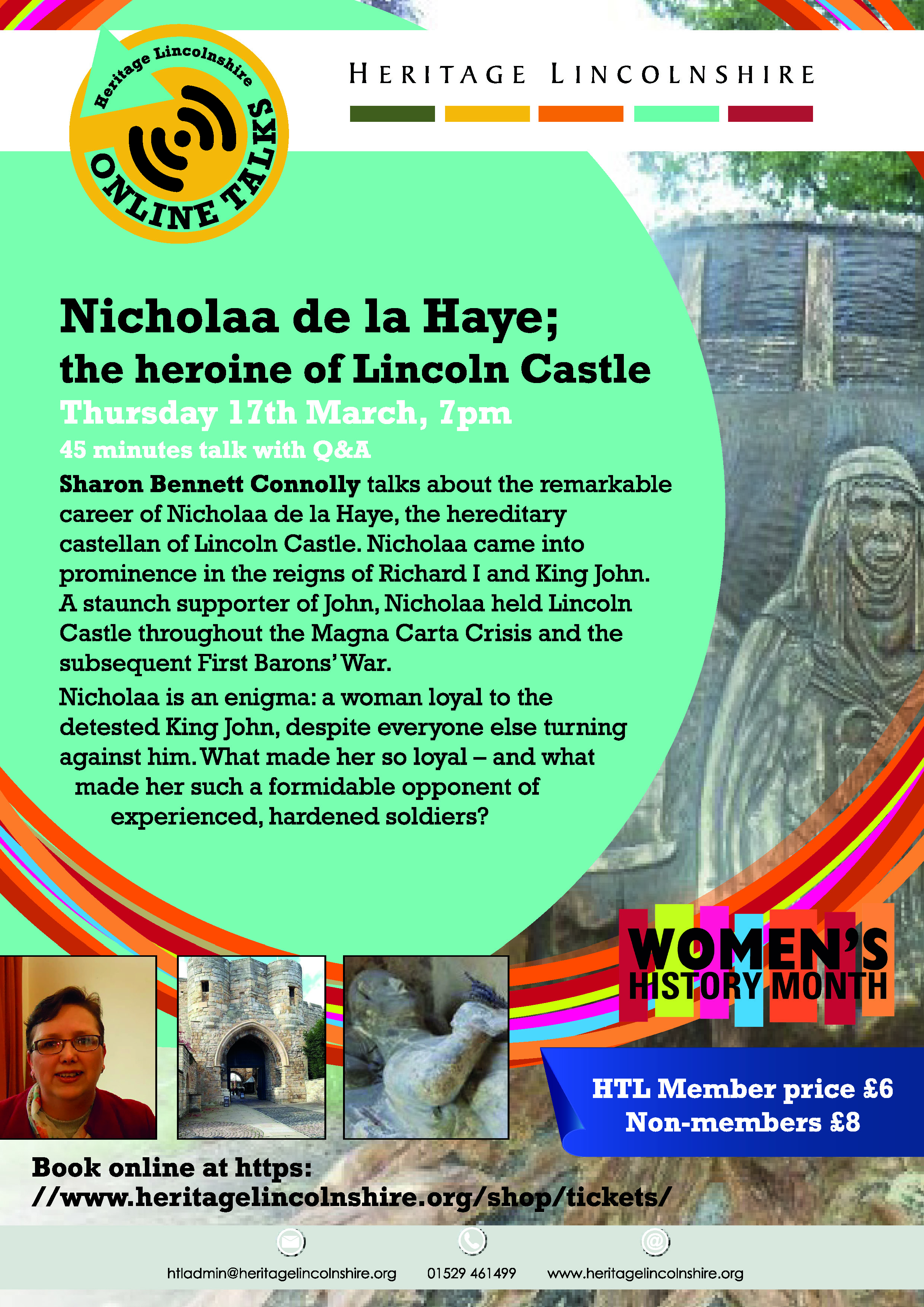 The second talk is, as you may have guessed, on my favourite subject,Nicholaa de la Haye, the Heroine of Lincoln Castle and will by via Zoom on 17 March at 7pm. The remarkable Nicholaa de la Haye held Lincoln Castle in no less than 3 sieges during the reigns of Richard I and King John – the last was a 6-week siege, ended by the 1217 Battle of Lincoln when Nicholaa was in her 60s. She was the first woman to be appointed sheriff in her own right.