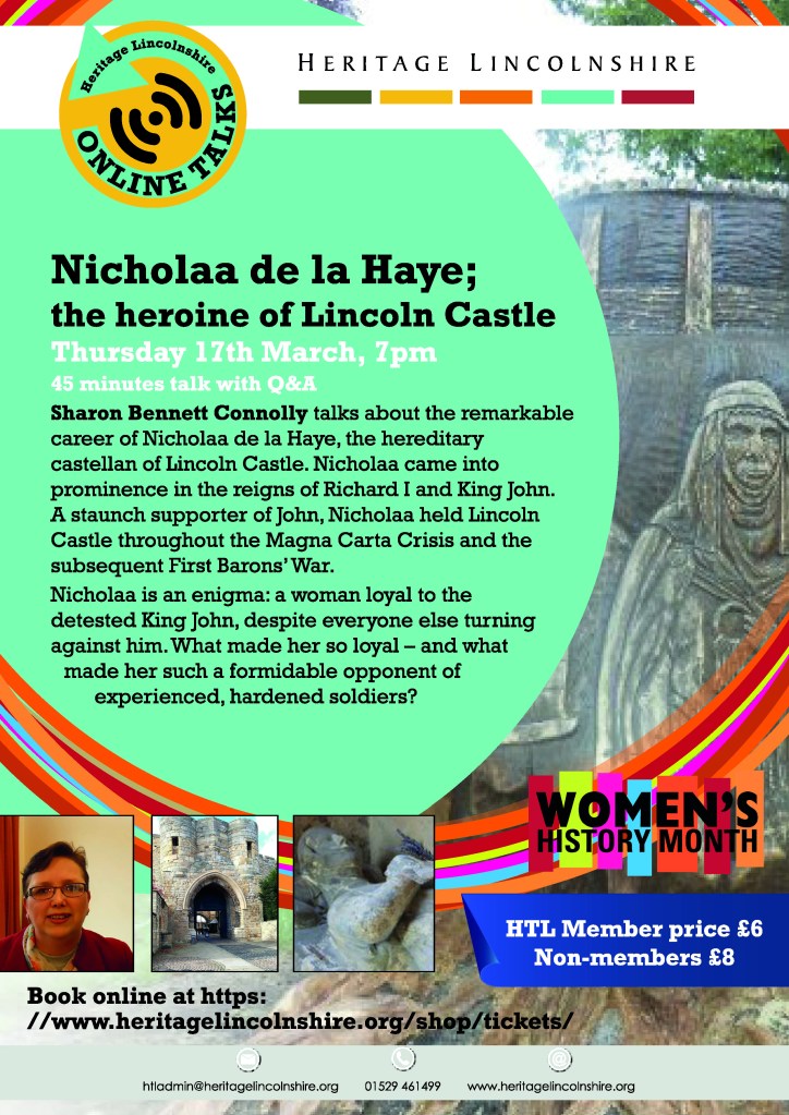 I can tell you about the 2 online talks I will be doing for Heritage Lincolnshire in March, to celebrate Women’s History Month. The first, Lincolnshire’s Medieval Heroines, will include the legendary Lady Godiva, the indomitable Nicholaa de la Haye, heiress Alice de Lacy and Katherine Swynford, the mistress who became a royal duchess. It will be a Zoom talk on 10 March at 7pm. The second talk is, as you may have guessed, on my favourite subject, Nicholaa de la Haye, the Heroine of Lincoln Castle and will by via Zoom on 17 March at 7pm. Tickets for both are available now and are £6 for members and £8 for non-members.