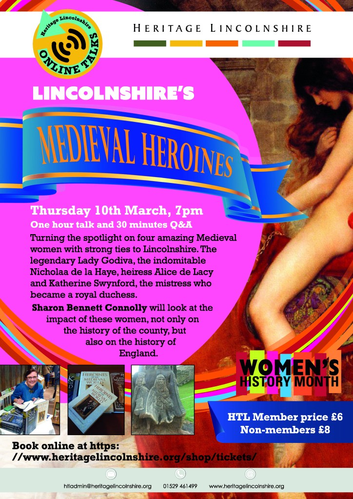 I can tell you about the 2 online talks I will be doing for Heritage Lincolnshire in March, to celebrate Women’s History Month. The first, Lincolnshire’s Medieval Heroines, will include the legendary Lady Godiva, the indomitable Nicholaa de la Haye, heiress Alice de Lacy and Katherine Swynford, the mistress who became a royal duchess. It will be a Zoom talk on 10 March at 7pm.